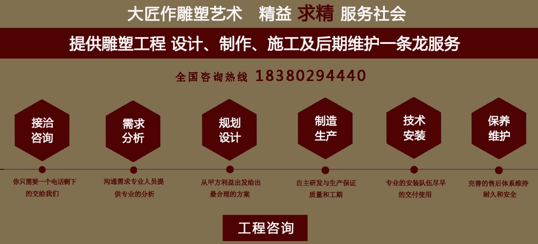 成都大匠作雕塑有限公司,是經成都工商局審定注冊的正規(guī)專業(yè)雕塑制作及工程安裝服務機構,是由一群年輕富有朝氣的年輕人創(chuàng)辦,發(fā)軔于四川省成都市龍泉驛區(qū)。它是一家******于創(chuàng)作、制作和銷售為一體的公司。大匠作擁有多年從事公共藝術的專業(yè)人員和雕塑制作人組成的核心團隊,為您提供專業(yè)、具創(chuàng)新的設計及制作服務。公司成立以來,秉承“******服務、誠信為本”的宗旨,以客戶需求為目標導向,不斷學習,進取,優(yōu)化和提高服務質量,公司向您******——“您的滿意***是我們的信譽”,我們將以飽滿的熱情和******的服務贏得您的贊譽和支持。 愛心,細心,耐心,責任心是我們的要求,盡心盡職,為您打造出創(chuàng)新、專業(yè)、******的設計方案,我們堅信先做人、后做事,用心對待客戶,實行透明收費,人性化服務,本著對客戶負責,對客戶負責,更是對自己發(fā)展負責的態(tài)度,爭取做到讓每位客戶滿意